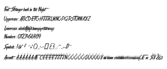 Dit lettertype, met iets versleten randen en een ongelijke basislijn, voelt zowel spontaan als rebels aan. Het is ideaal voor posters, albumhoezen, streetwear branding en cinematografische titels. De lange, smalle karakters en snelle krommingen creëren een gevoel van beweging, waardoor het prachtig past bij projecten die een vleugje spanning of intrige vereisen. Stranger back in the Night nodigt uit tot creatieve expressie met een sombere, underground esthetiek die opvalt in de duisternis.